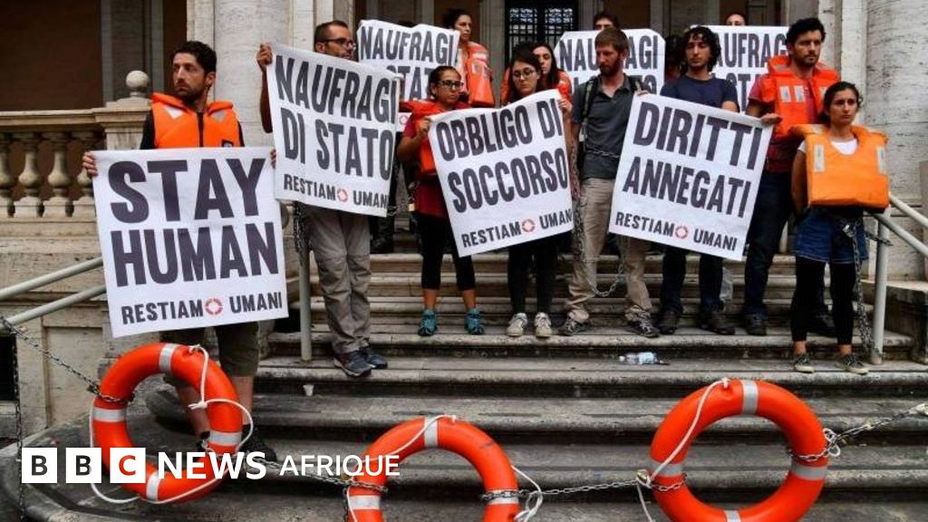 Portant des chaînes aux pieds et aux mains, vêtus de gilets de sauvetage orange, les militants brandissaient des pancartes dénonçant en italien un "Naufrage d'Etat", le "Naufrage des droits" et affirmant "l'Obligation des secours".