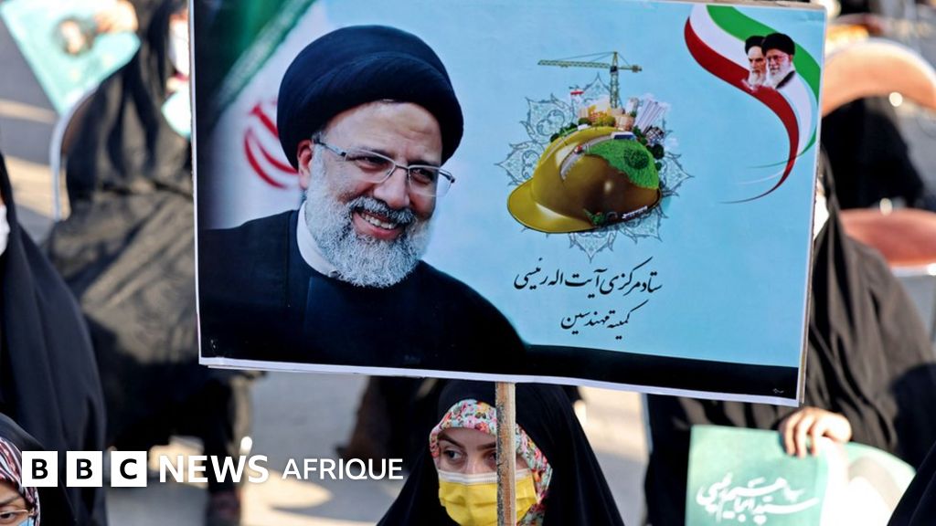Légende image, Des partisans du candidat à la présidence iranienne Ebrahim Raisi tiennent des photos de lui lors d'un rassemblement électoral, à Eslamshahr, en Iran (6 juin 2021).