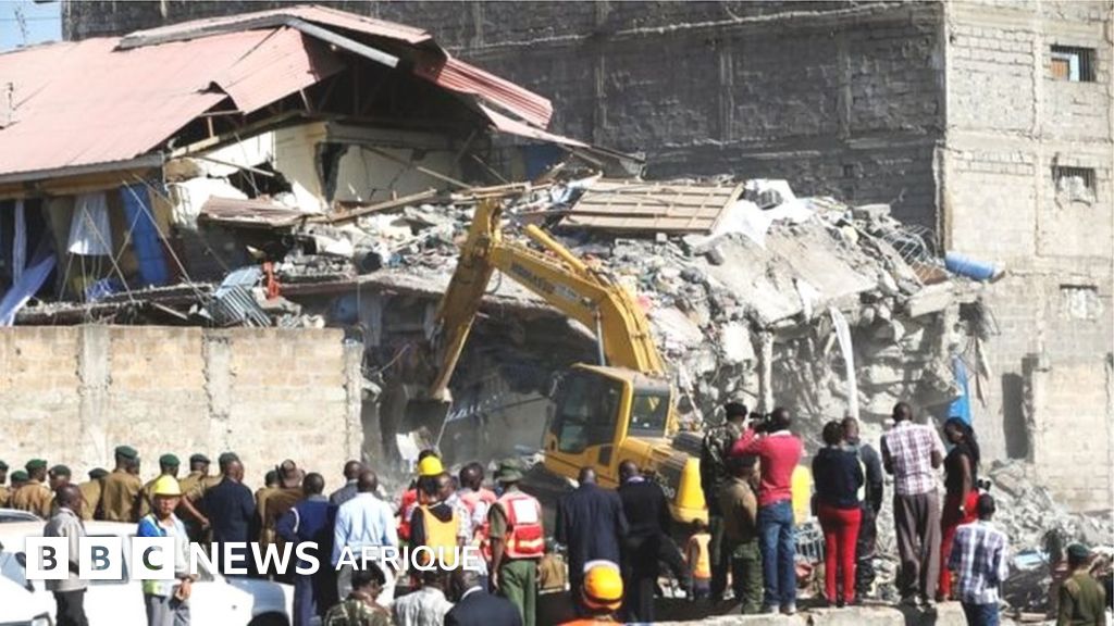 Des photos publiées sur Twitter par la Croix-Rouge kényane montrent des opérations de déblaiement en cours mardi matin, à l'aide d'une excavatrice, sur les décombres de l'immeuble effondré, dont on voit encore distinctement le toit en tôle rouge.