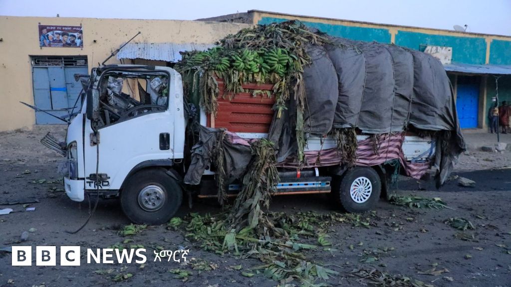 ከጭነት መኪናዎቹ አንዱ በአሽከርካሪ መቀመጫ ጋቢናው ላይ ጉዳት ደርሶበት ይታያል። በሸራ ከተሸፈነው የተሽከርካሪው ጭነት ውስጥ የተወሰነው የተገለጠ ሲሆን የተገለጠው ክፍል ላይ ጥሬ ሙዝ ይታያል።