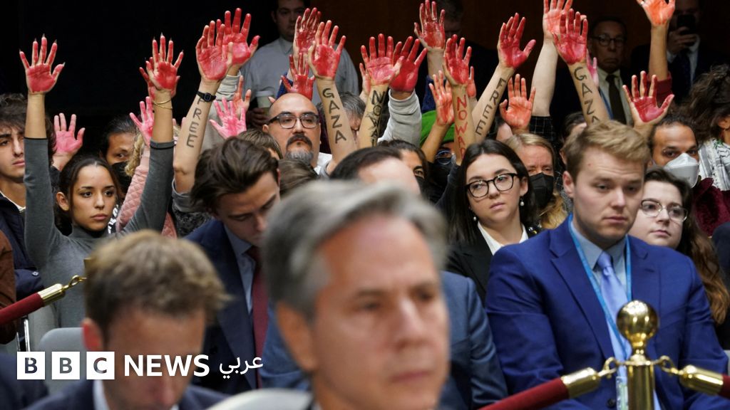 حرب غزة: "بأياد ملطخة بالطلاء الأحمر".. مقاطعة بلينكن في جلسة دعم إسرائيل وأوكرانيا