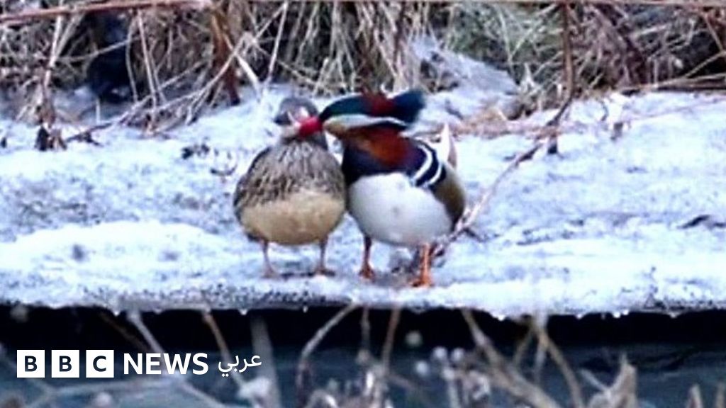 أظهر تسجيل مصور التقطه صيني ذكرَ بط صيني وهو يتودد إلى أنثى عند ضفاف نهر في شمال الصين.