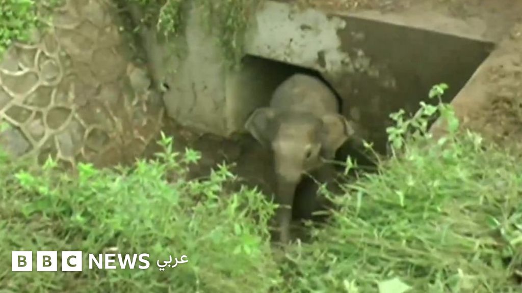 وجدت أنثى فيل نفسها وصغيرها عالقين في فتحة تصريف مياه في سريلانكا.