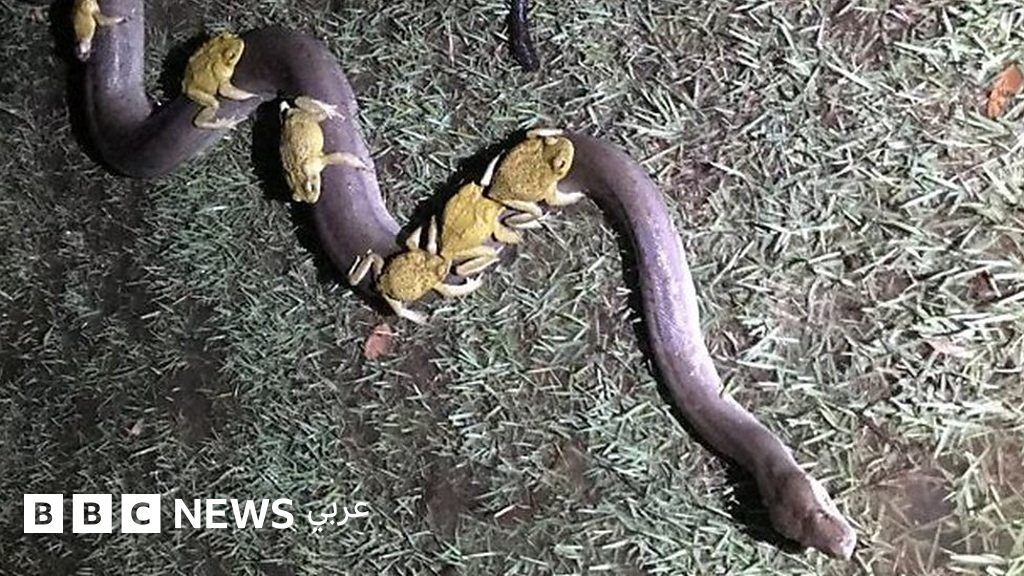 10 ضفادع تسافر على ظهر ثعبان هربا من الفيضان