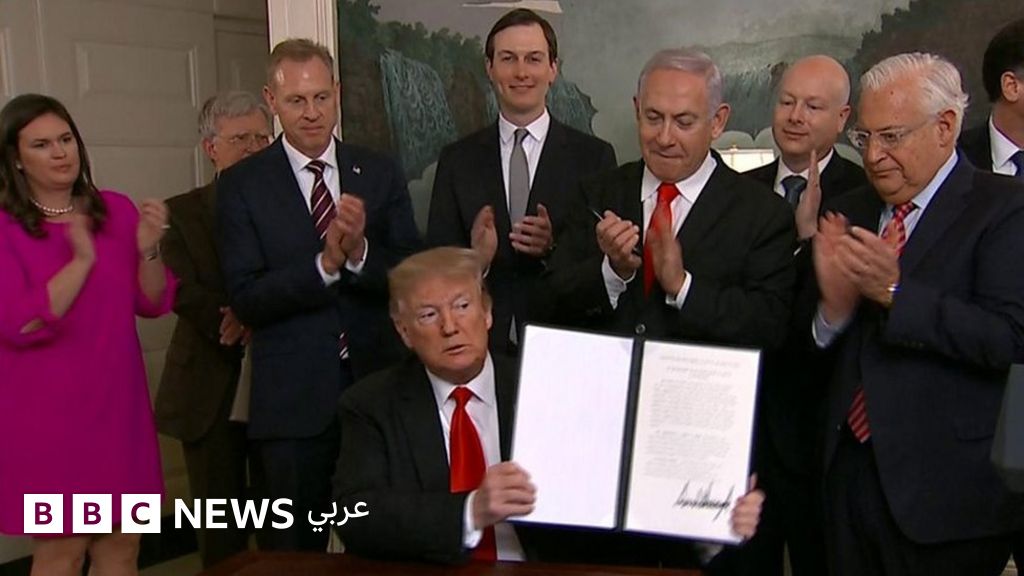 لحظة توقيع دونالد ترامب لإعلان يعترف بسيادة إسرائيل على الجولان المحتل