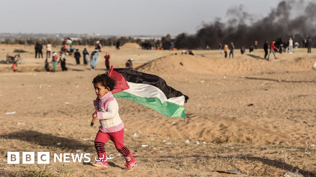 طفل فلسطينية ترفع العلم الفلسطيني قرب الحدود بين إسرائيل وقطاع غزة