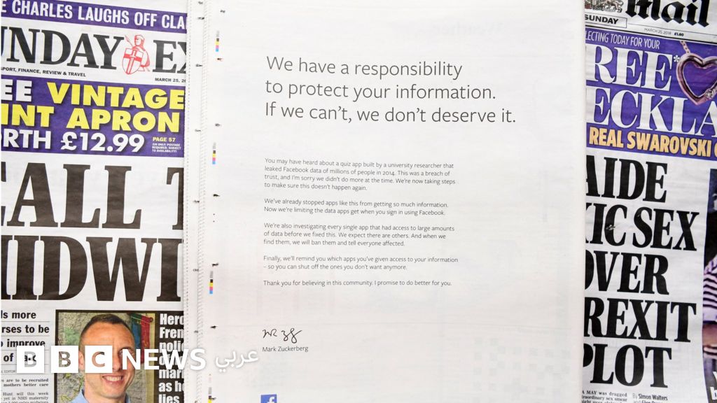 احتل اعتذار نشره مارك زوكربرغ،الرئيس التنفيذ لشركة فيسبوك، صفحة كاملة في عدد من الصحف الكبرى في الولايات المتحدة وبريطانيا عن فضيحة خصوصية البيانات التي تعرضت لها الشركة منذ أيام.