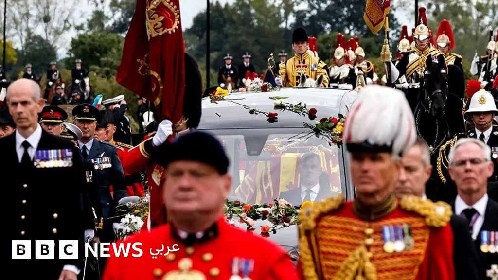 نعش الملكة في رحلته الأخيرة إلى قلعة وندسور، بعد قداس جنائزي في كنيسة ويستمنستر.