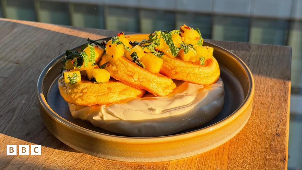 For the topping, finely dice pineapple before adding chopped mint and sugar. Serve over the pancakes.