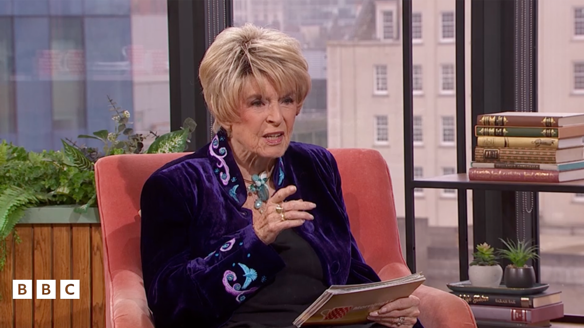 Rip Off Britain's Gloria Hunniford sitting on an orange velvet chair in the Morning Live studio in a purple jacket. She is wearing a necklace and has blonde short hair.