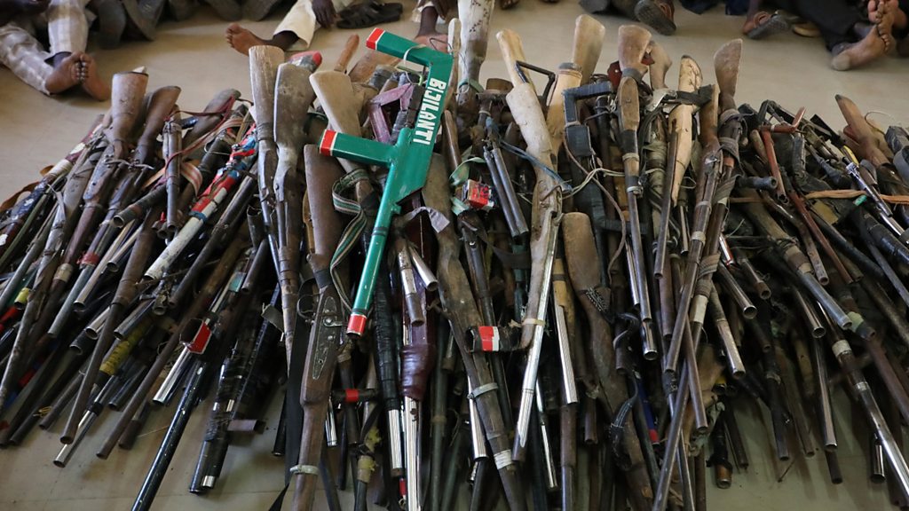 Photo: Some of the weapons used by vigilantes in Zamfara state, north west Nigeria, 2019 (Photo by Kola Sulaimon / AFP via Getty Images)
