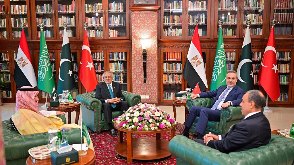 (A handout photo made available by the Pakistani Foreign Offices shows Turkish Foreign Minister Hakan Fidan, Saudi Foreign Minister Prince Faisal bin Farhan, Egyptian Foreign Minister Badr Abdelatty and Pakistan's deputy Prime Minister Ishaq Dar during a meeting in Islamabad, Pakistan, 29 March 2026. CREDIT: PAKISTAN FOREIGN OFFICE/HANDOUT/EPA/Shutterstock)