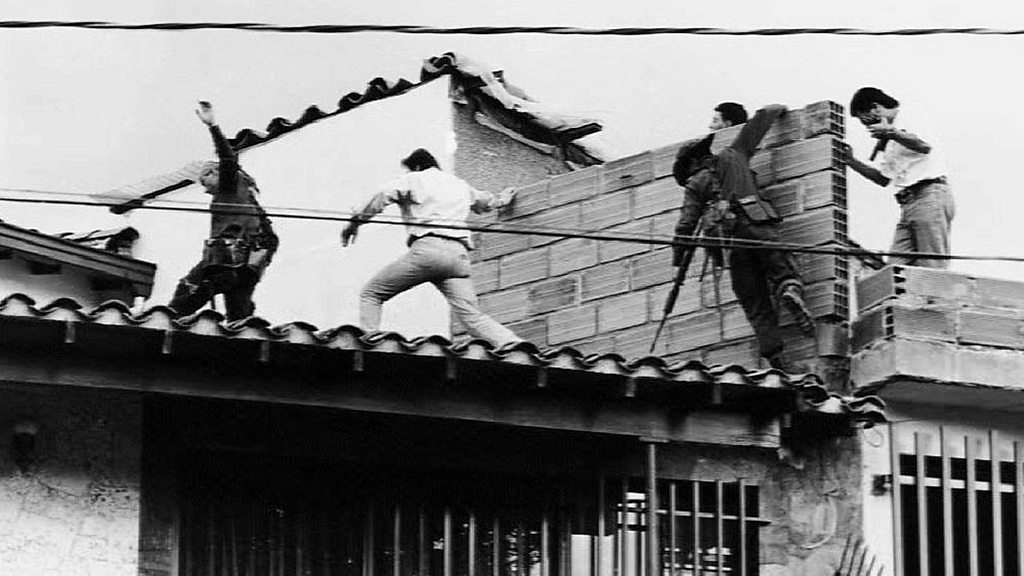 Photo: Colombian police and military forces storm the rooftop where drug lord Pablo Escobar was shot dead just moments earlier during an exchange of gunfire between security forces and Escobar and his bodyguard on 2nd December 1993. (Credit:Jesus Abad-el Colombiano/AFP/Getty Images)