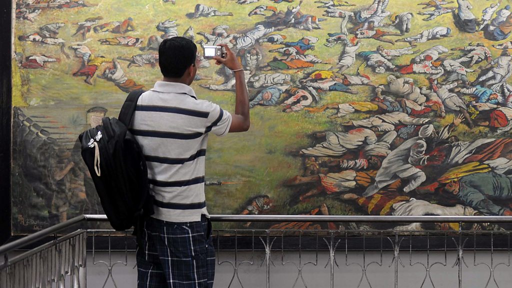 Photo:An Indian man takes a photograph of a painting depicting the Jallianwala Bagh massacre in Amritsar. The Amritsar massacre, also known as the Jallianwala Bagh Massacre, took place on April 13, 1919 when British Indian Army soldiers on the direct orders of their British officers opened fire on an unarmed gathering killing at least 379 men, women and children, according to official records. (Credit: NARINDER NANU/AFP/Getty Images)