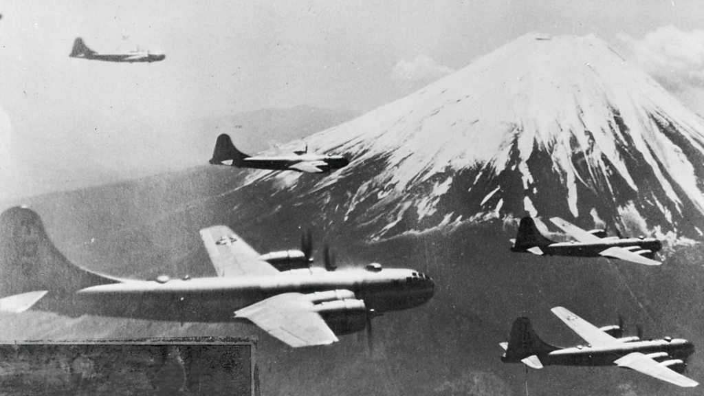 Photo: B-29 bombers passing Mount Fuji on their way to Tokyo, April 1945 (Getty Images)