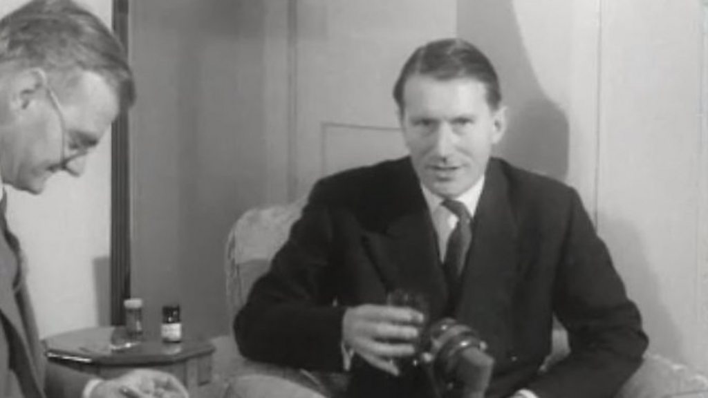 Photo: Christopher Mayhew (right) preparing to start the experiment, watched by Dr Humphry Osmond (left), December 1955. (BBC)
