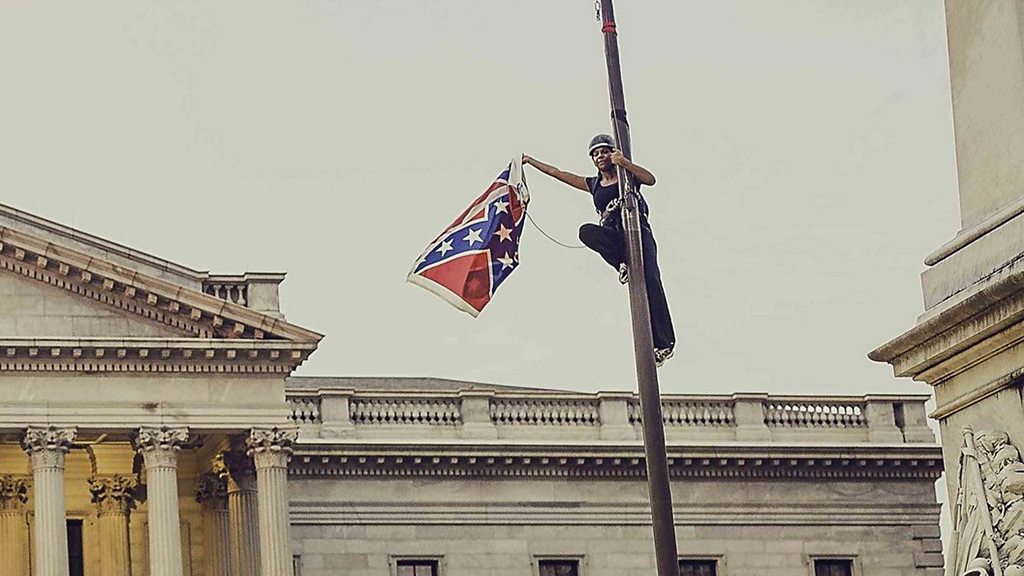 In June 2015 an American anti-racist activist climbed a flagpole on the South Carolina state house grounds to take down the Confederate flag. The protest followed the killing of 9 black people at a historic Charleston church by a white supremacist who was pictured holding the flag. The Confederate flag was the battle flag of the troops who fought to retain slavery during America’s civil war. For African Americans the flag is a symbol of slavery, segregation and black subordination. Bree Newsome Bass talks to Farhana Haider about her act of protest.