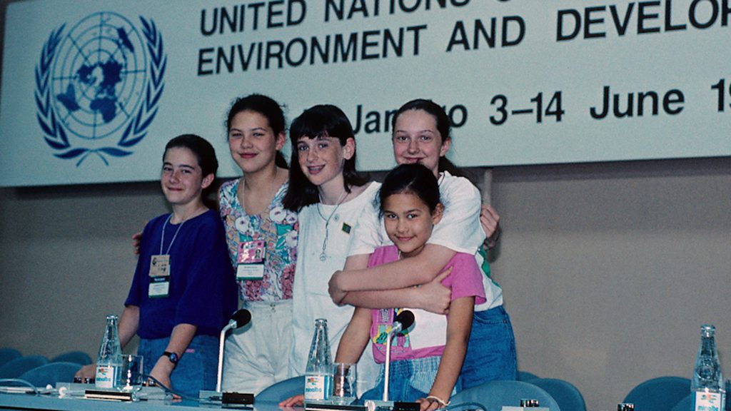 Photo: Severn Cullis-Suzuki (2nd left) and her friends at the Earth Summit in Rio in 1992. Courtesy of Severn Cullis-Suzuki.