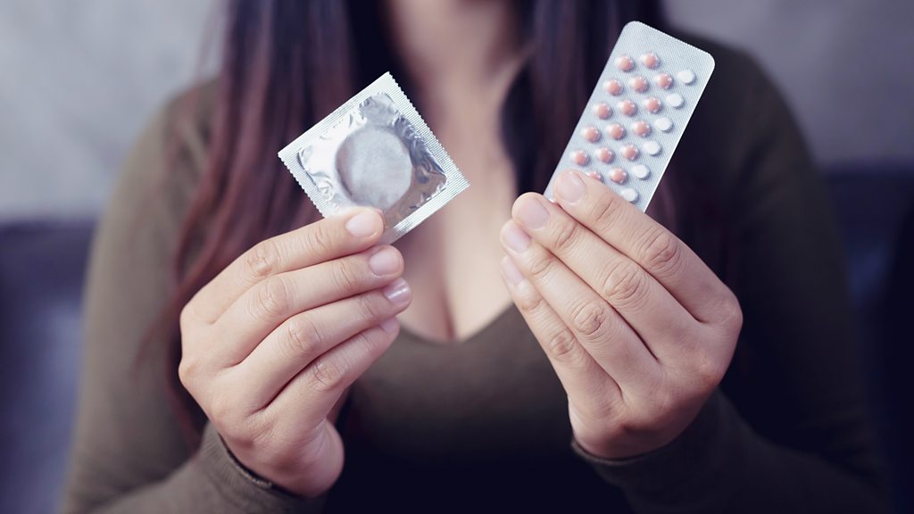 Photo: a woman holding up a condom and some contraceptive pills. Credit: Getty Images.