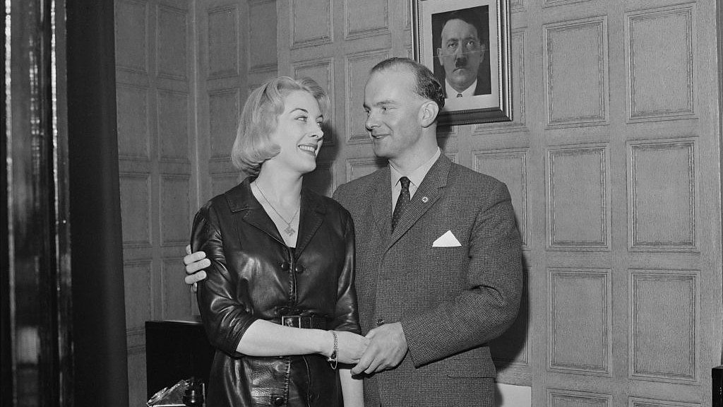 (Photo: British neo-Nazi politician Colin Jordan and French socialite Francoise Dior, UK, 7 October 1963; she is wearing a swastika shaped pendant and behind them, a portrait of Adolf Hitler. Credit: Felkin/Daily Express/Hulton Archive/Getty Images)