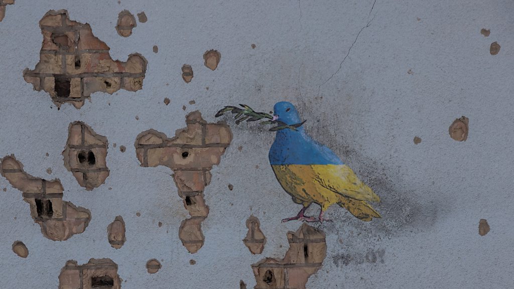 (Image: A drawing of a bird on a wall in Kyiv. Credit: Roman Pilipey/Getty Images)