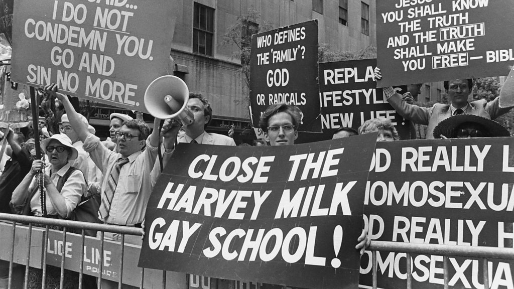 PHOTO: A protest outside the Harvey Milk High School in 1985 (Getty Images)