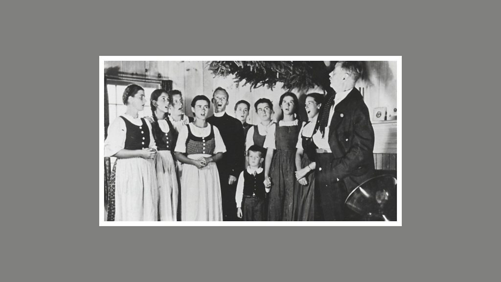 (Photo: Black and white photo of the von Trapp family at Christmas in 1943 - Johannes is just a young boy at the front and centre of the photo with eight of his siblings, and Captain von Trapp is to the right of the photo. Credit: von Trapp Family Lodge & Resort)