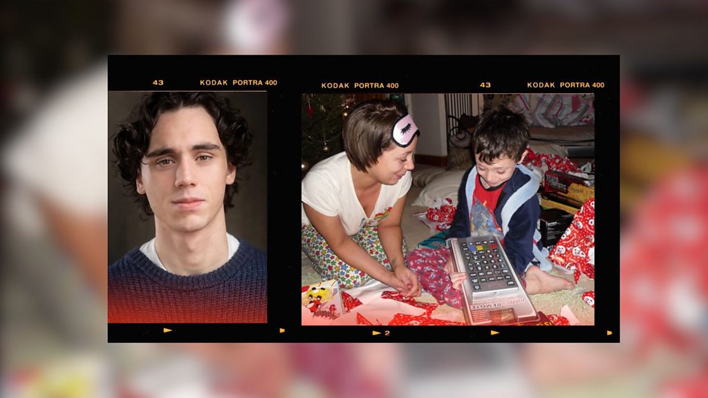 (Photo: Two images side by side; on the left, a headshot of Ollie aged 23; on the right, a photograph of Ollie aged 6 with his mum Charlie. They are sitting on the floor unwrapping Christmas presents, Ollie has just unwrapped a large calculator. Credit: Ollie Maddigan)