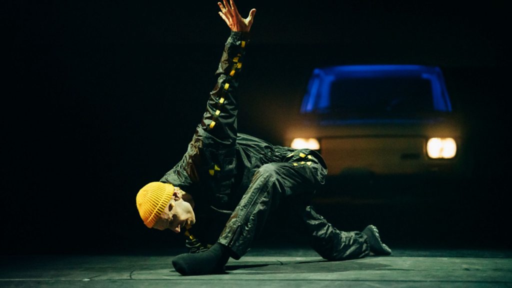 (Photo: Marc Brew during his dance-theatre production An Accident/A Life, co-created with Sidi Larbi Cherkaoui. Marc is balanced on one foot and arm low to the ground on a dark stage, with a car behind him facing the audience with its headlights on. Credit: Filip Van Roer)