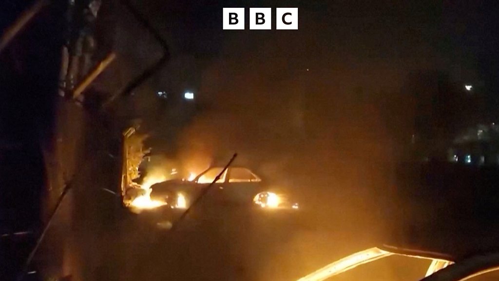 (Photo: Car on fire on a street in Iran. Credit: WANA/Reuters/BBC Images)