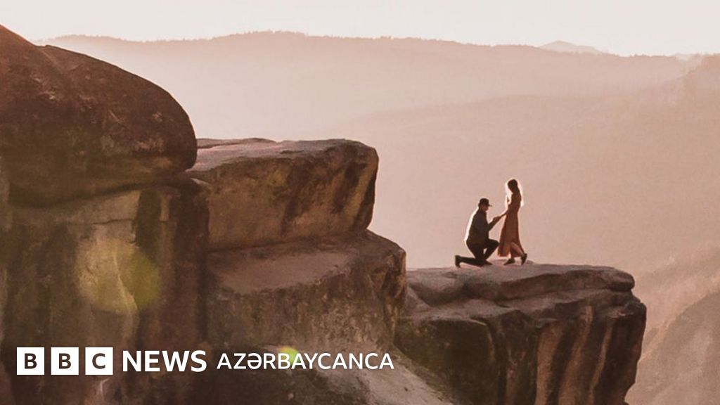 Bu fotoda şlyapalı kişi uçurumun kənarında bir dizi üstə çökərək uzun libasda olan qadına evlilik təklif edir.