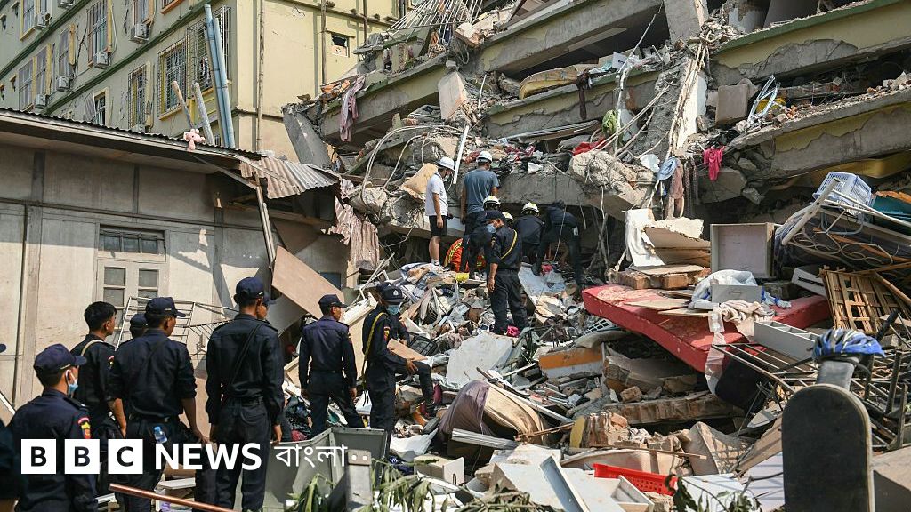 ছবির ক্যাপশান, ভূমিকম্পে বিপর্যস্ত মিয়ানমারের শহর মান্দালয়ে উদ্ধারকাজ চলছে