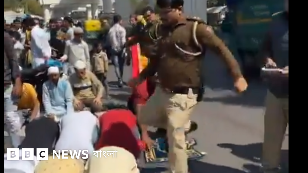 ভিডিওটিতে দেখা যাচ্ছে, রাস্তায় অনেকে একসঙ্গে নামাজ পড়ছিলেন। তারা যখন সিজদা করছেন, তখনই এক পুলিশ কর্মী নামাজিদের লাথি মেরে সরিয়ে দেওয়ার চেষ্টা করছেন।