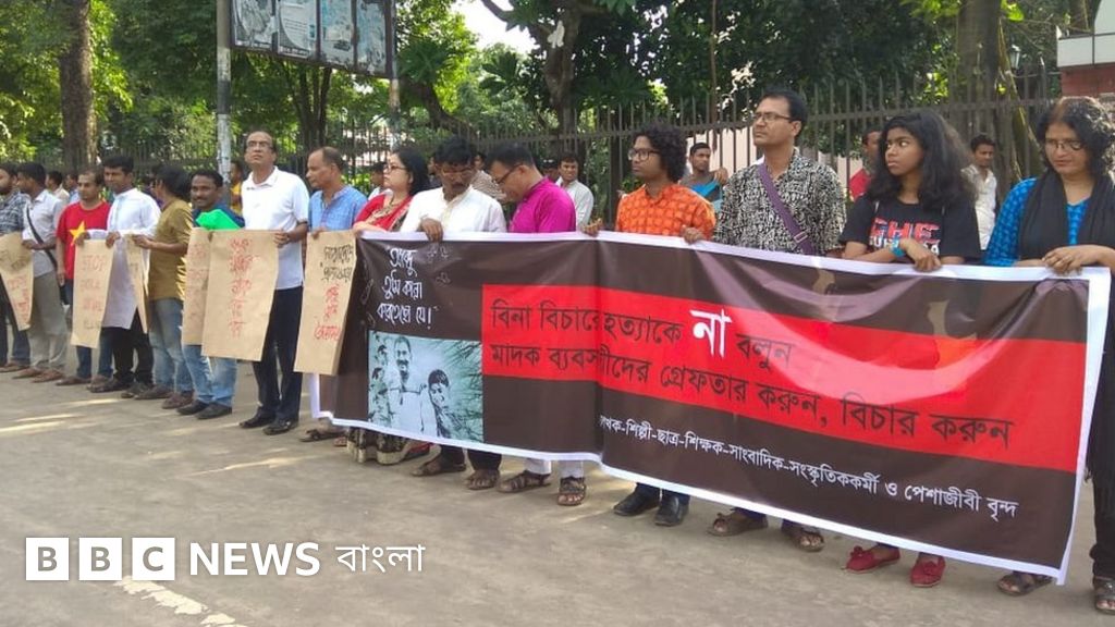 বাংলাদেশে 'মাদকবিরোধী অভিযানে বন্দুকযুদ্ধের নামে ১৩০ জনেরও বেশি মানুষের বিচারবহির্ভূত হত্যাকাণ্ডের' প্রতিবাদে ঢাকার শাহবাগের মানববন্ধন ও সমাবেশ করেছে শিল্পী, সাহিত্যিক, প্রকাশকসহ পেশাজীবীদের একটি দল।