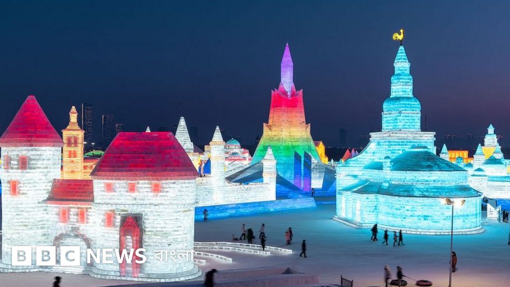 চীনের হারবিন শহরে বরফ উৎসব: কেল্লা থেকে শুরু করে জনপদ সবকিছু তৈরি বরফে