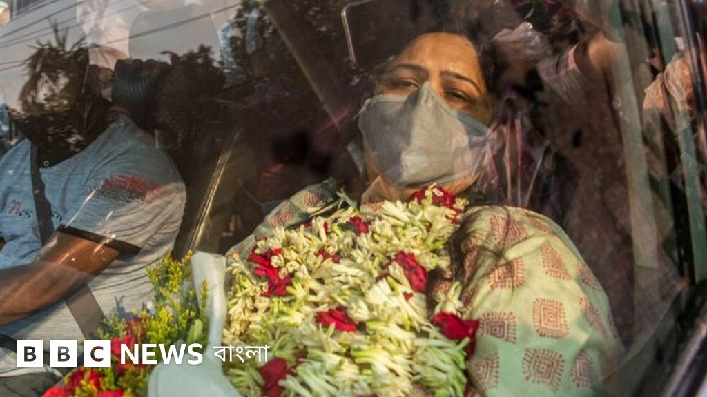 ছবির ক্যাপশান, কাশিমপুর কারাগার থেকে মুক্তি পাওয়ার পর অনেকেই রোজিনা ইসলামকে ফুল দিয়ে স্বাগত জানান