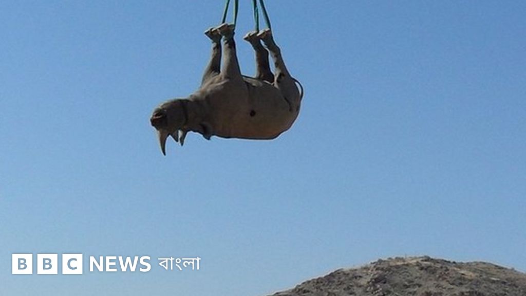 পরিবহন: রবিন র্যাটক্লিফ ও সঙ্গীরা। বিষয়: গণ্ডারকে উল্টো করে ঝুলিয়ে হেলিকপ্টারে উড়িয়ে নিয়ে যাওয়া কতটা নিরাপদ।