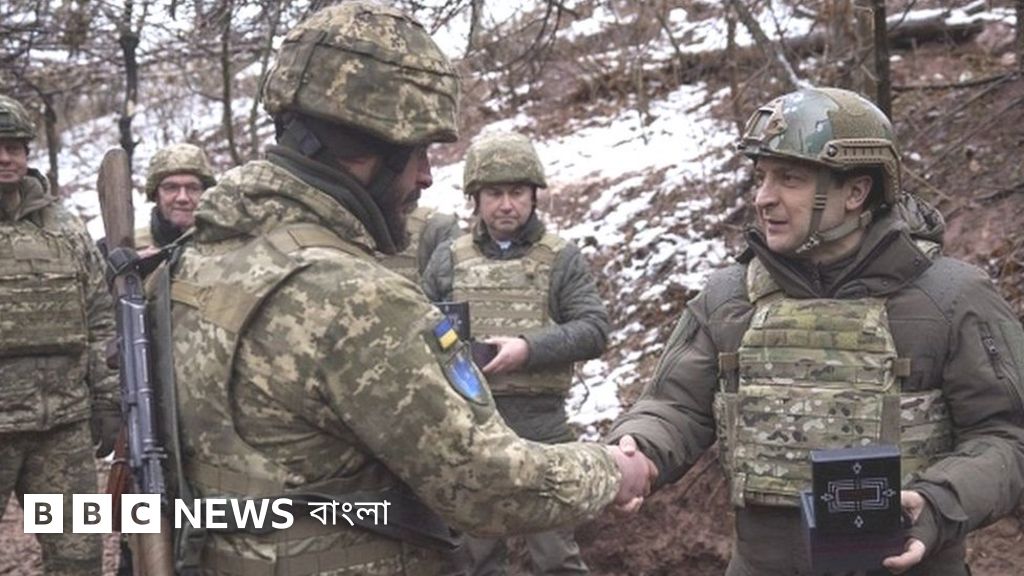ছবির ক্যাপশান, সৈন্যদের সঙ্গে কথা বলছেন ইউক্রেনের প্রেসিডেন্ট জলোনস্কি