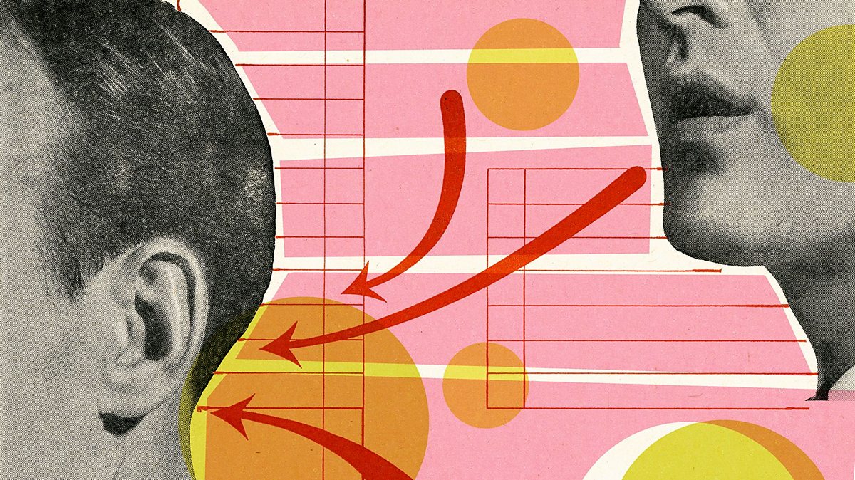 A pop art style image of a man speaking directly into the ear of another man