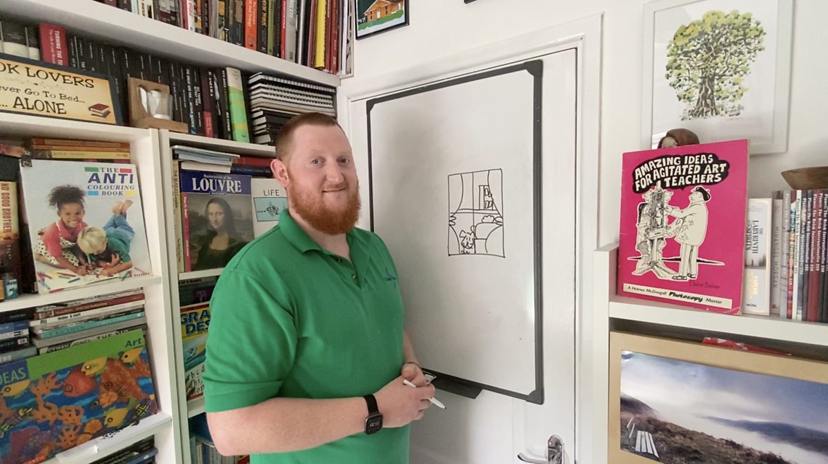 Fold a piece of paper in half, and then in half again, like Siôn did in the video. Think of the paper as a window. Now, watch thevideo again and make a picture as you watch Siôn make his picture.