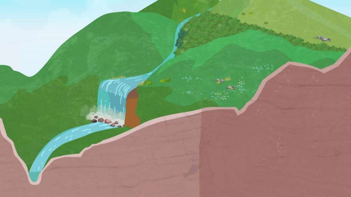 Thoir cunntas agus mìneachadh, le diagraman leubailte, air mar a chaidh na feartan aibhne a leanas a chruthachadh: