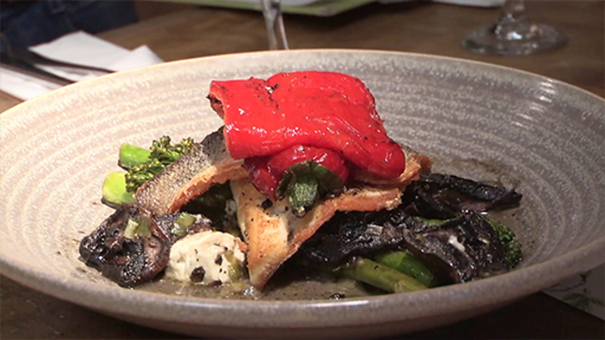 Speaker 2: So we’ve got sea bass with broccoli, feta cheese, mushroom Portobello and pineapple and ginger dressing. Finished with nice Romano pepper.