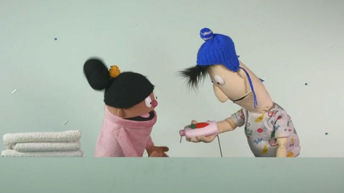 Declan shows Pip the picture of a strawberry on the soap bottle.