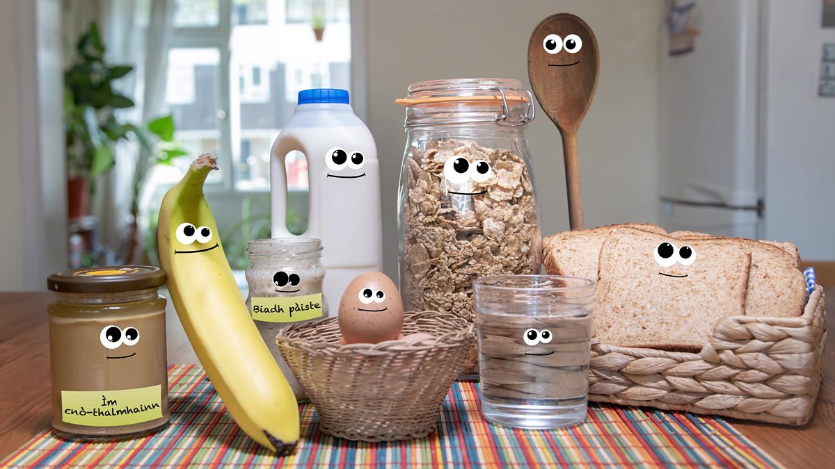 - Pròtain – biadh a bhios a' togail fhèithean fallain agus a' leigeil le ar bodhaigean fàs agus iad fhèin a leigheas. Biadh mar iasg, feòil, pònairean, pòran-cochaill agus uighean.