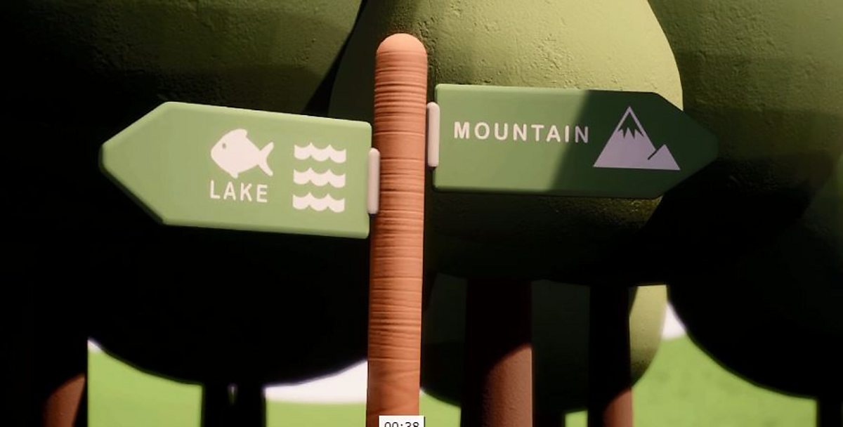 They’re at a fork in the road. There are two signs, one pointing one way, one the other. The route to the right has a sign that looks like a steep incline. The left has water and a fish on it.