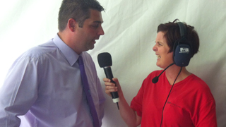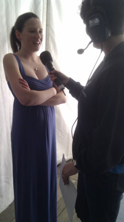 Roedd hi'n andros o boeth gefn llwyfan heddiw ac un oedd yn teimlo'r gwres oedd Rhian James. Mae Rhian yn aelod o Ddawnswyr Caerdydd ac o dan y wisg frethyn roedd ganddi bais a theits hefyd!!