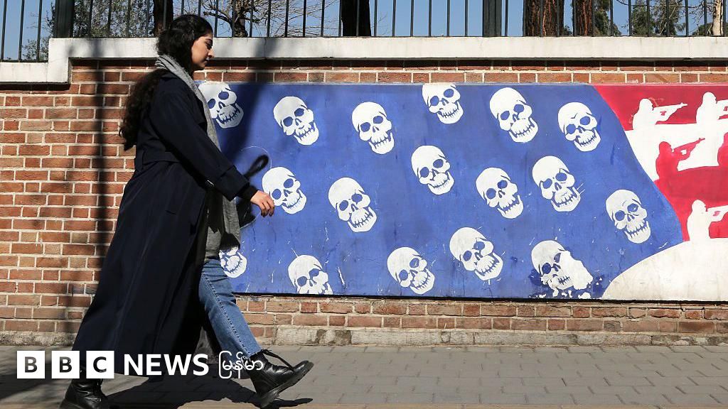 အမေရိကန် အလံမှာ ကြယ်တွေအစား အရိုးခေါင်းပုံတွေဆွဲထားတဲ့ အီရန်က နံရံပန်းချီနားမှာ အမျိုးသမီးတစ်ယောက် လမ်းလျှောက်နေ