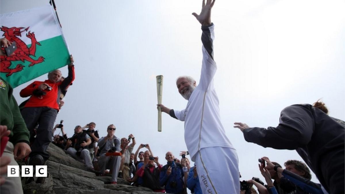 Roedd rhai cannoedd o bobl ar Yr Wyddfa i weld y Fflam yn cael ei chludo i'r copa gan Syr Chris Bonnington