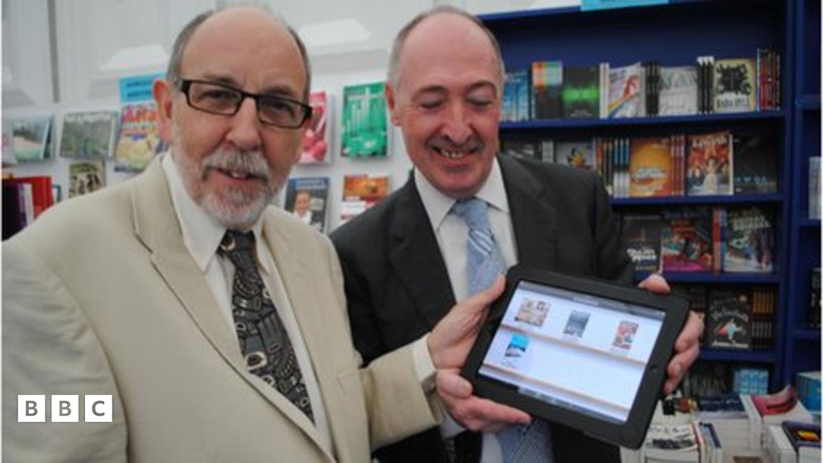 Phil Davies ac Elwyn Jones o Gyngor Llyfrau Cymru yn dangos yr ap newydd