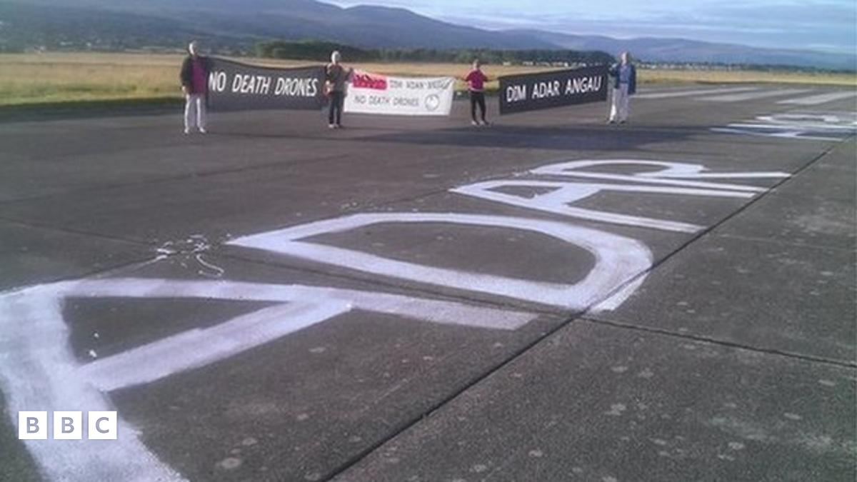 Dywedodd y gymdeithas mewn datganiad: "Torrodd aelodau o Gymdeithas y Cymod i mewn i Faes Awyr Llanbedr ger Harlech gan beintio'r geiriau 'Dim Adar Angau' ar y lanfa.